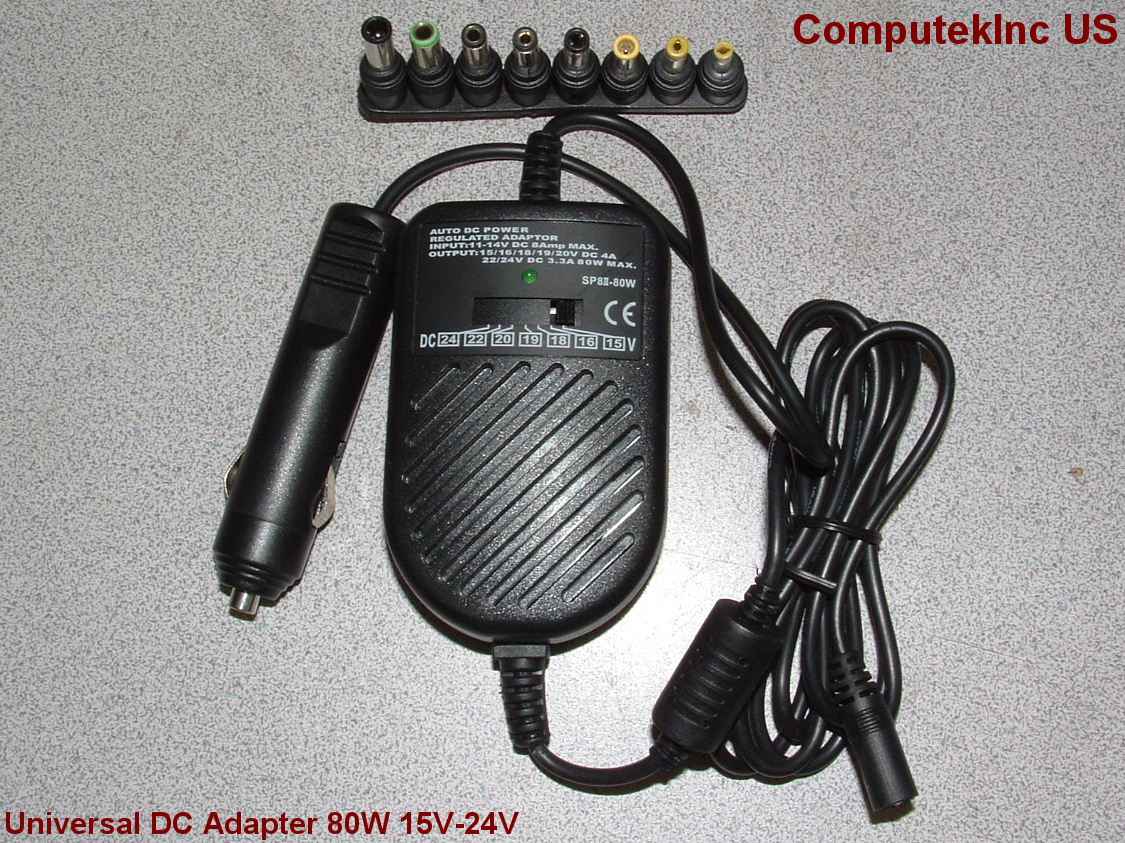 80W (4A Max) Universal AC adapter with 8 different connector ends Compaq 1.65mm End / Acer 1.65mm End / Micron 5mm End / HP 1.65mm End / Gateway 2mm End / HP/Compaq 2.5mm End / Toshiba 3mm End / Sony 6mm End 1pc - Retail package DC Car Adapter : $18.99