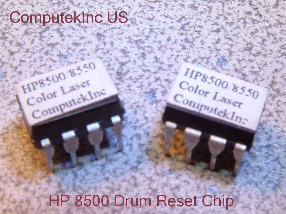 Has your HP 8500 or 8550 color LaserJet popped up a "drum life out" error? What has happened is the chip in your drum has approached 25,000 B/W or 6,250 Color pages printed and shut down. If your printouts still looked perfect quality when this error message came up all you need to do is change the drum chip out to get your printer back to work. Quick run through of the chip and waste removal for 4500 and 4550 click Here New HP 8500 / 8550 Drum reset chips.